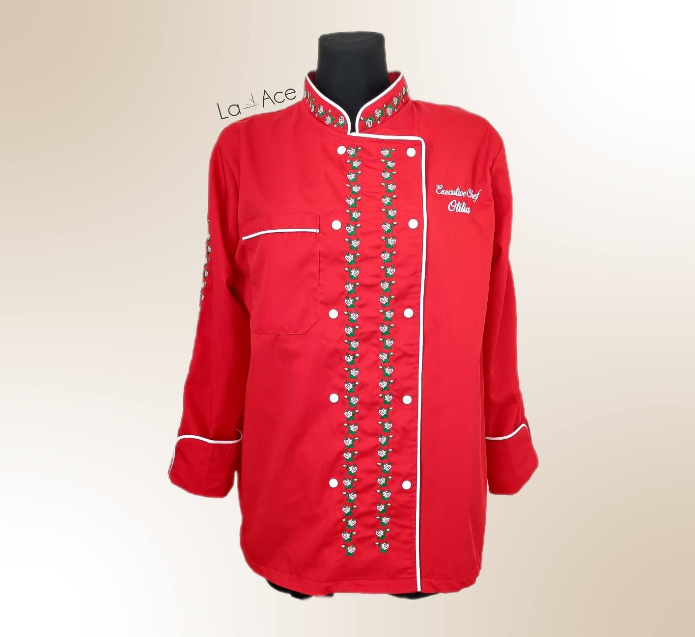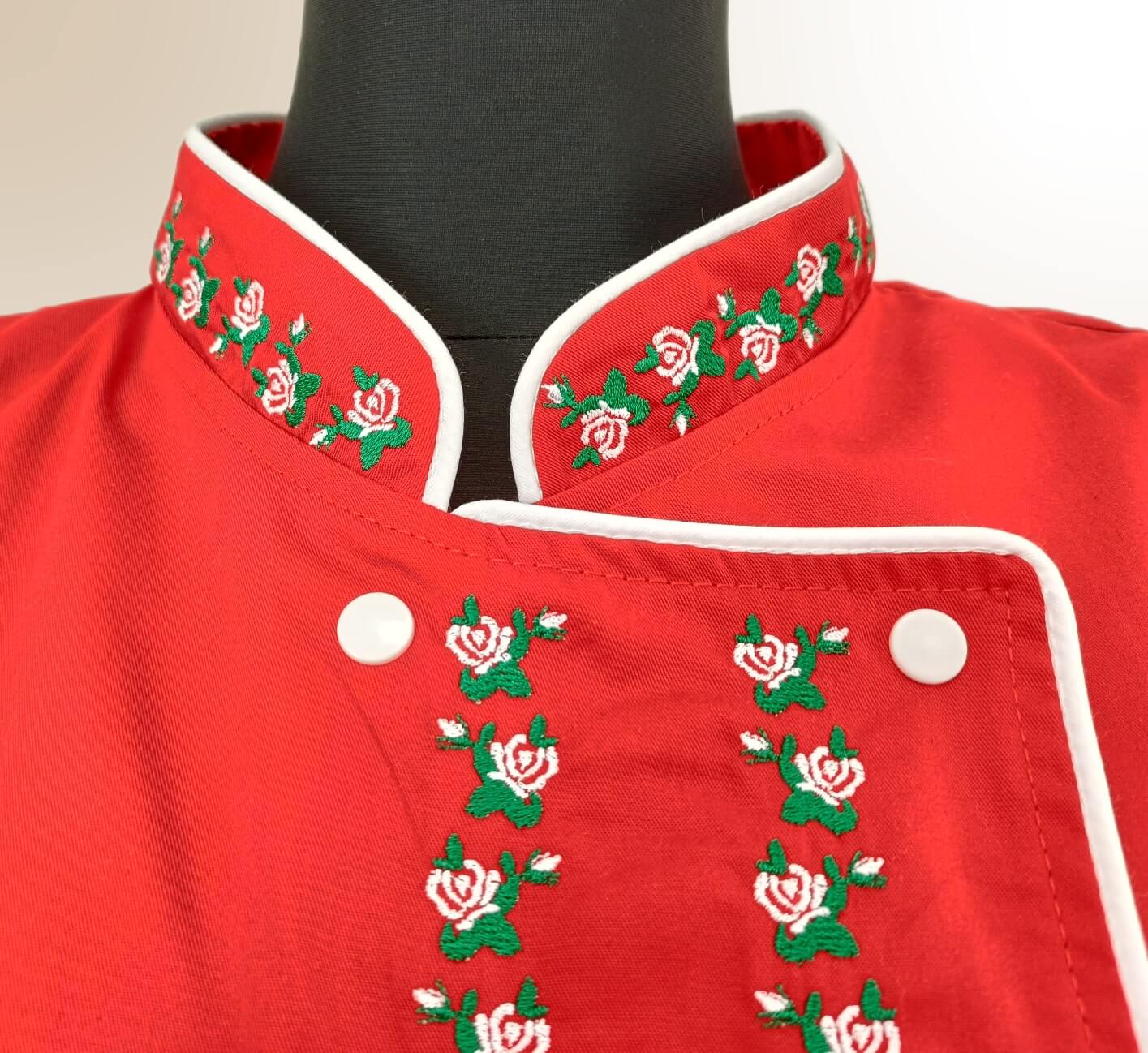 Noi iubim să croim românește! Tu iubești să gătești românește! De aceea am creat câteva modele care să le îmbine pe ambele. Îți prezentăm tunica roșie tradițională brodată cu mulți trandafirași mici – pe mâneci, pe piept și pe guler.