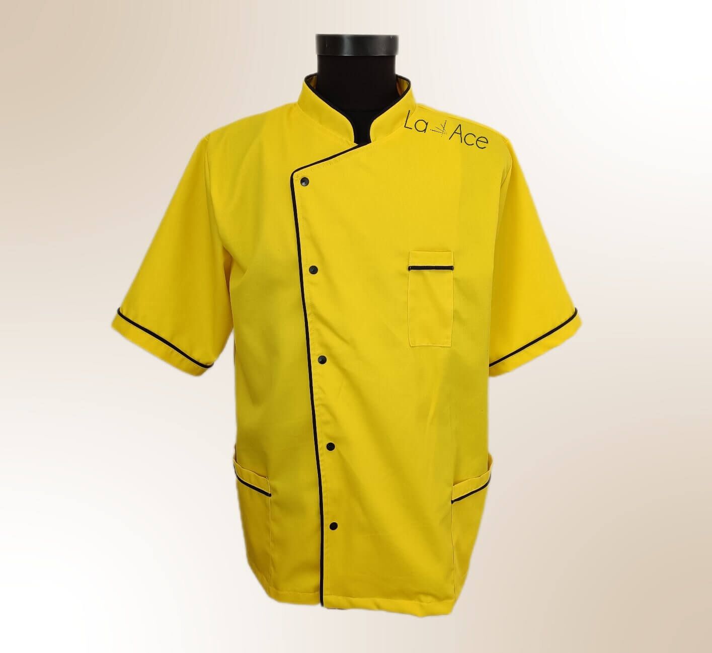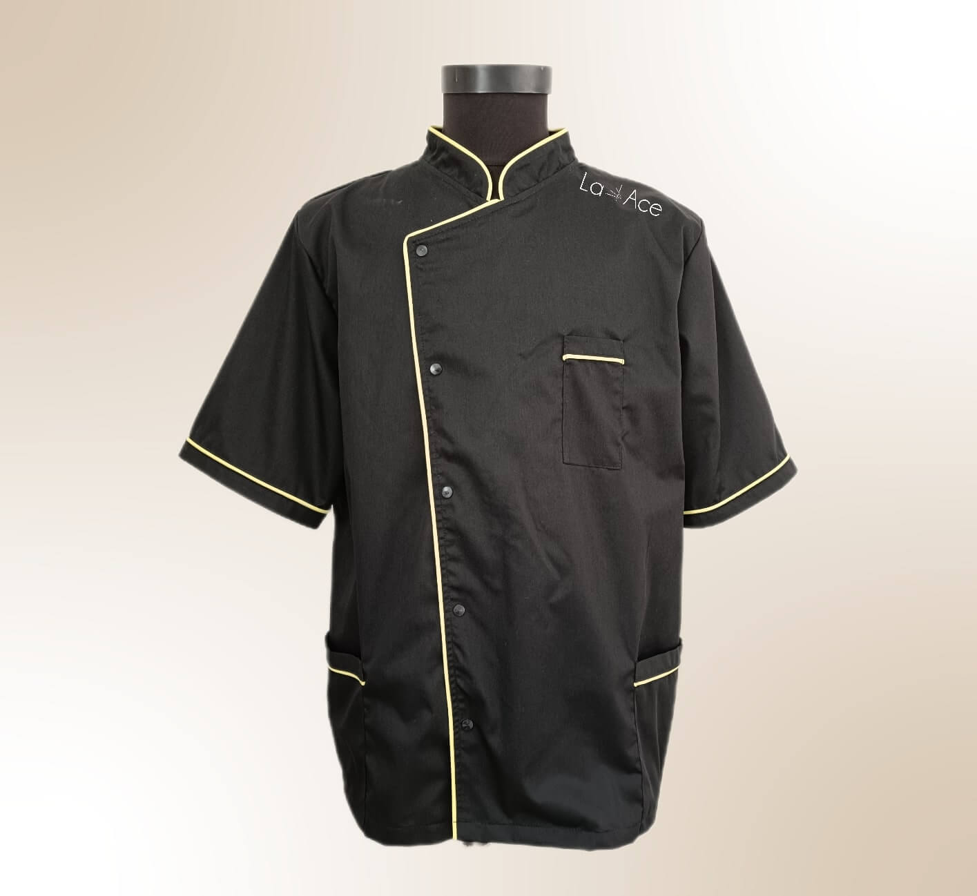 Tunică pentru frizeri, cu închidere oblică, pe capse.
